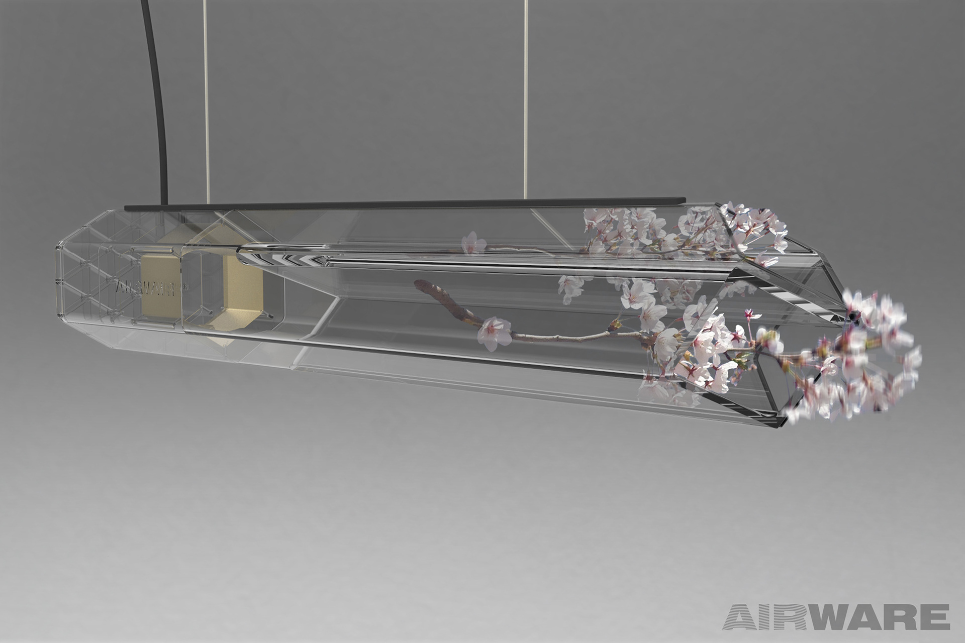 Airware is a personal project exploring the possibilities of using an asymmetric capacitor for high volume airflow; no moving parts. Airflow is achieved using ion thrust or electrohydrodynamics (EHD), high voltage, low amperage particles jump the gap between the electrodes pulling the air particles creating thrust and ozone. Recent research suggests electrohydrodynamic propulsion is more energy efficient than any other means of propulsion, generating up to 100N of thrust per kilowatt of power. Airware is designed around its heart, the hexagonal set of gold plated electrodes. The body of the fan itself is clear to highlight the motionless aspect of the fan’s silent function. The clear airflow chamber guides the air and houses tree blossoms or flowers. An LED down light illuminates the blossoms in a darkened room. The thruster disperses the fragrance throughout the room providing an invigorating, freshness to any indoor room. The electronically controlled airflow can create dynamic air movement for a more natural feel; like bring the outdoors inside. The breeze gently moves the blossoms like wind through the trees. The faint purple-blue corona adds to the mystery of its function. The ionized air provides a healthy filtration effect, reducing pollen and dust particles in the air, a healthful benefit for allergy sufferers. Airware is the most simplified form of the fan. Relax. Invigorate. Enjoy.